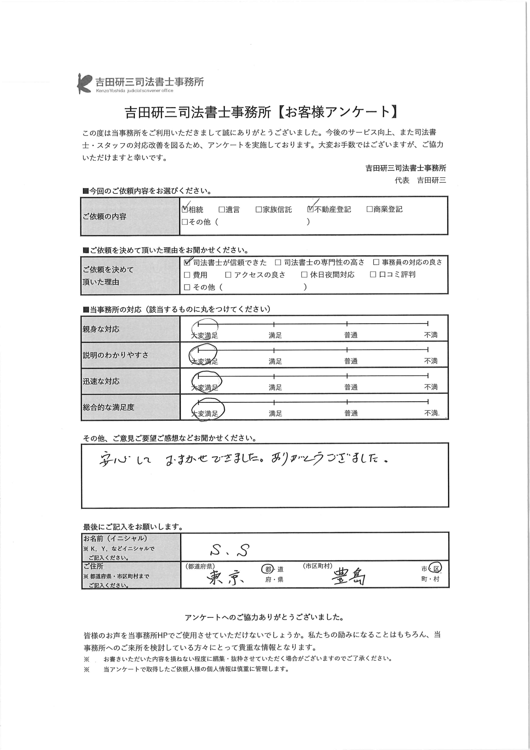 • 安心しておまかせできました。ありがとうございました。(相続・不動産登記 豊島区 S・S 様)