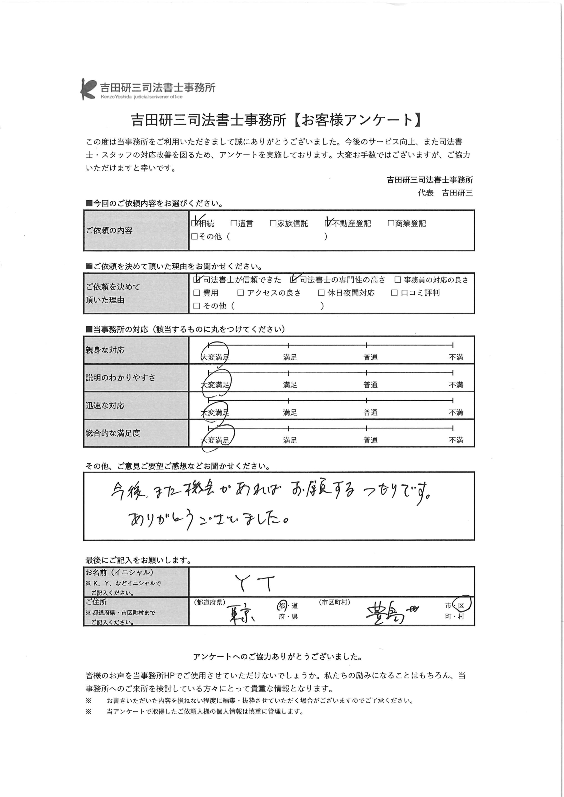 今後、また機会があればお願いするつもりです(相続・不動産登記 豊島区 Y・T 様)