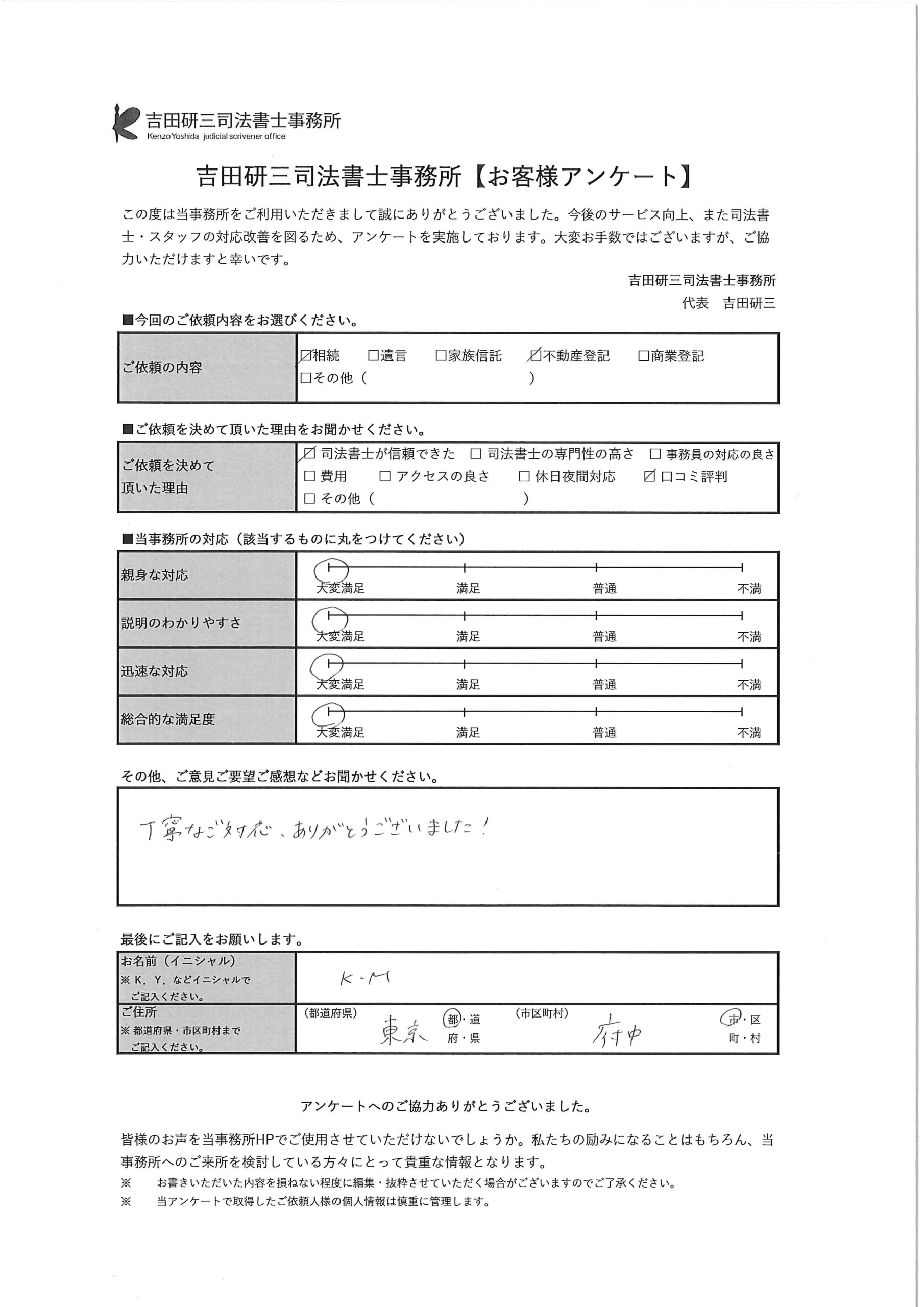 丁寧なご対応、ありがとうございました!(相続・不動産登記 府中市 K・M 様)