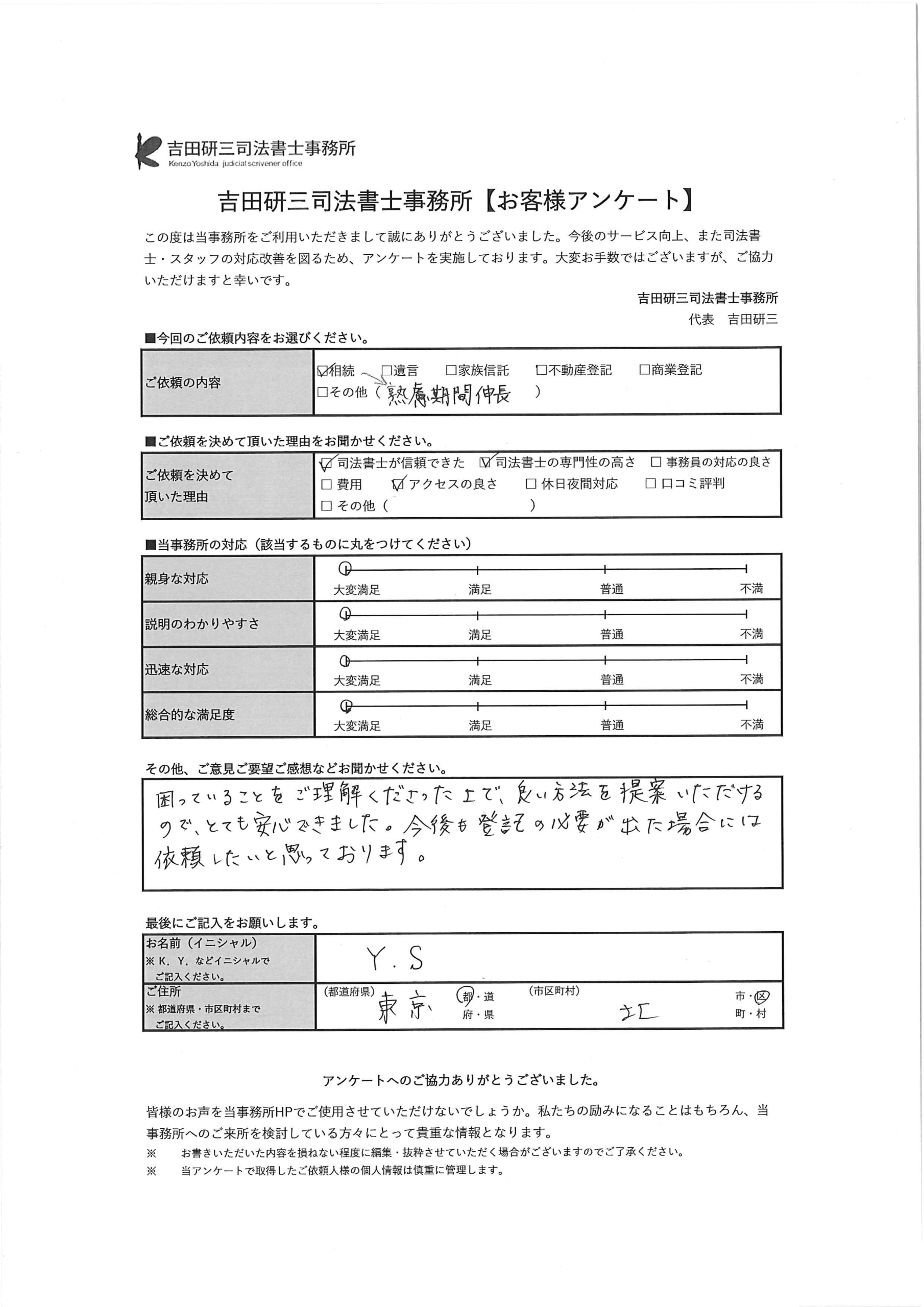 困っていることをご理解くださった上で、良い方法を提案いただけるので、とても安心できました。(裁判所提出書類作成 北区 Y・S 様)