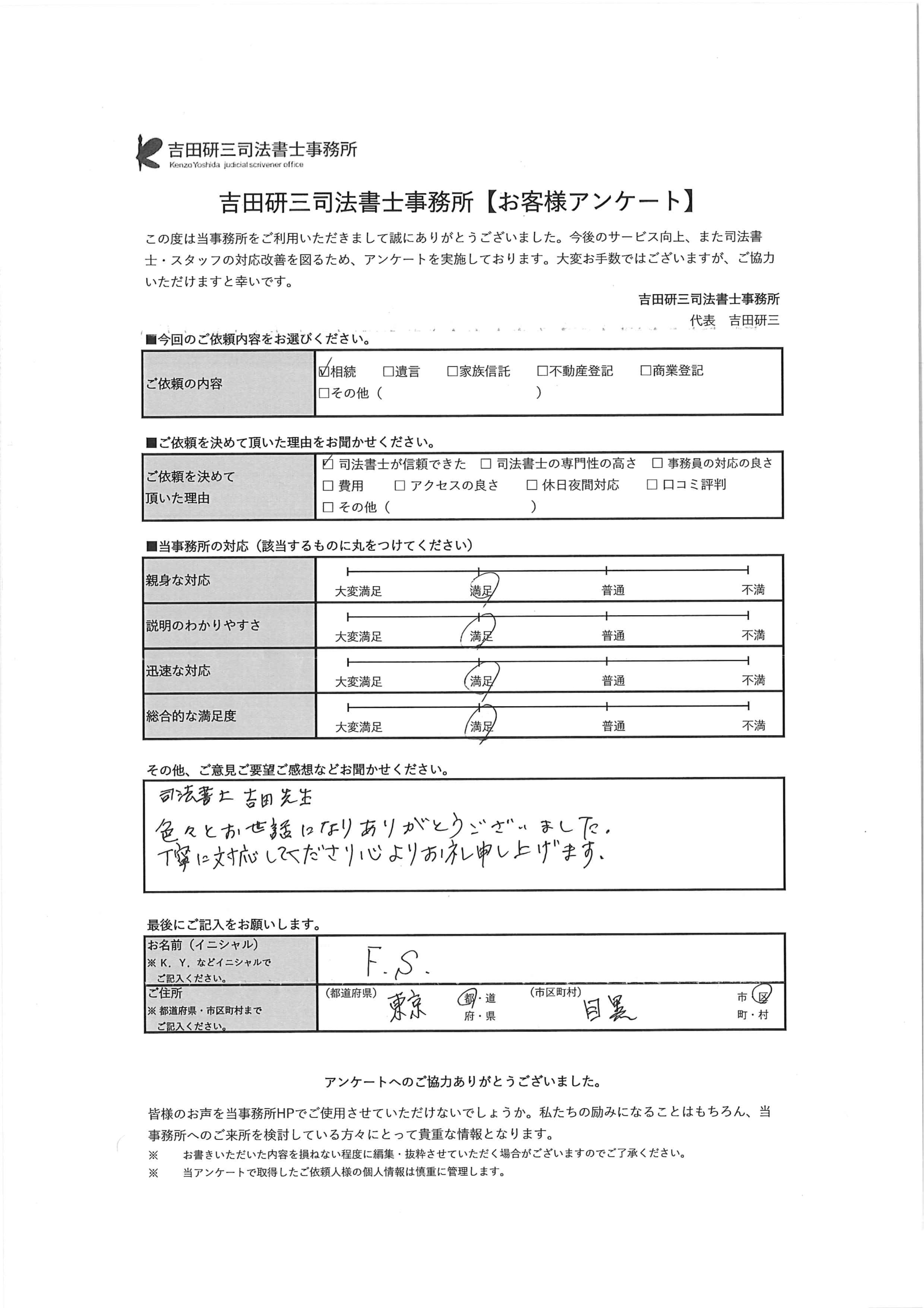 丁寧に対応してくださり心よりお礼申し上げます(相続 目黒区 F・S 様)
