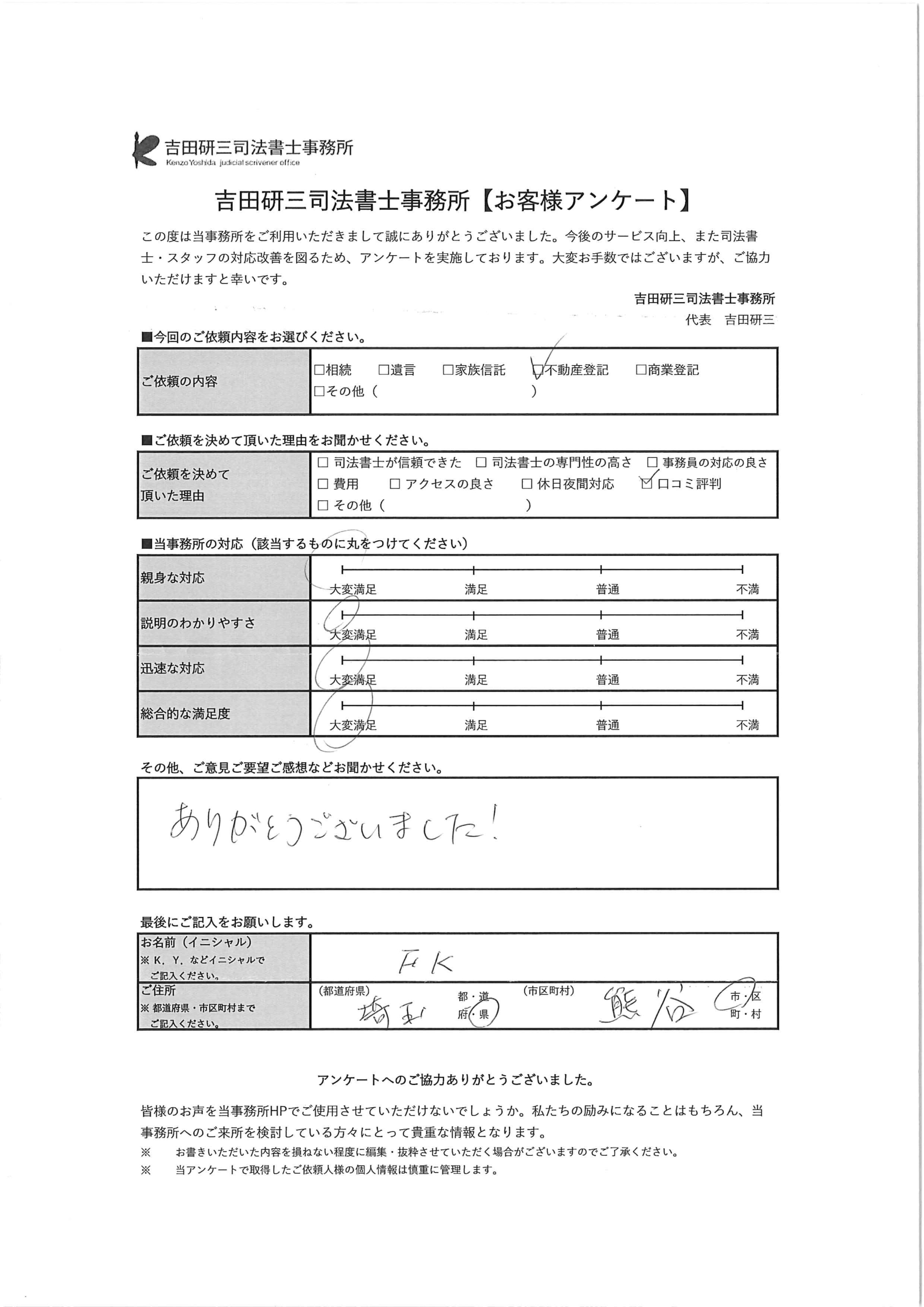 ありがとうございました! (不動産登記 熊谷市 F・K 様)