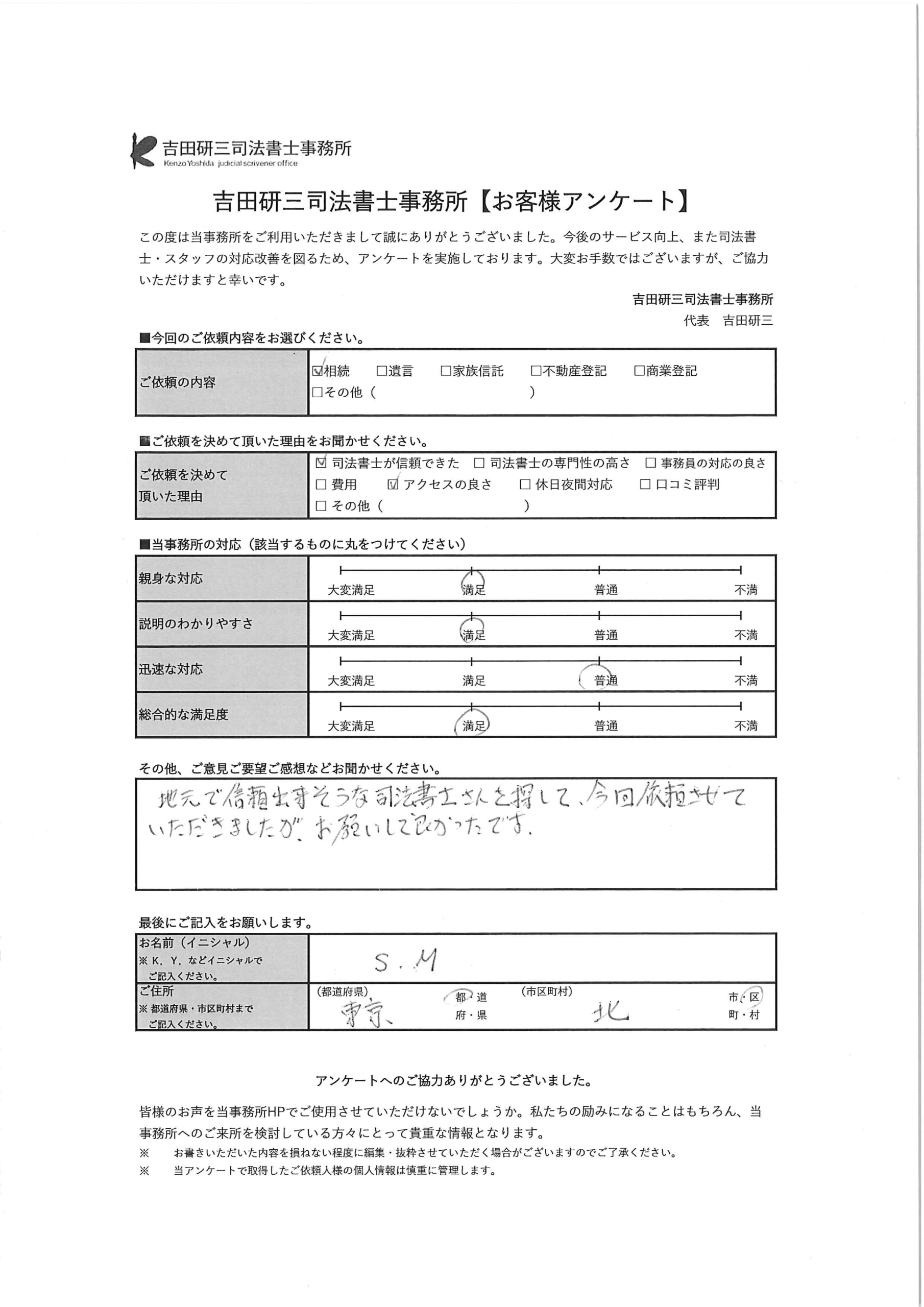 地元で信頼できそうな司法書士さんを探して、今回依頼させていただきましたが、お願いして良かったです。(相続 北区 S・M 様)