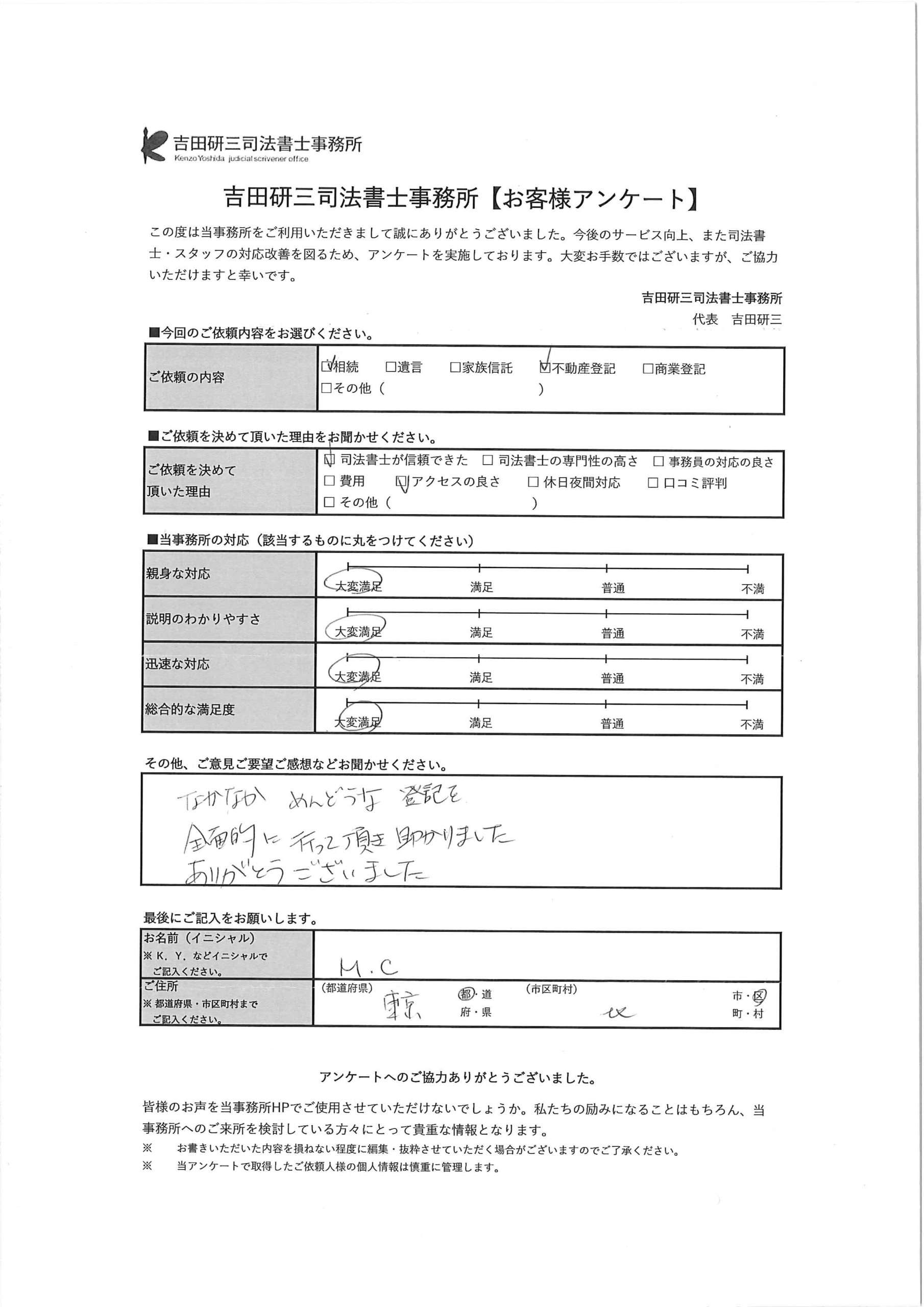 なかなかめんどうな登記を全面的に行って頂き助かりました。(相続・不動産登記 北区 M・C 様)
