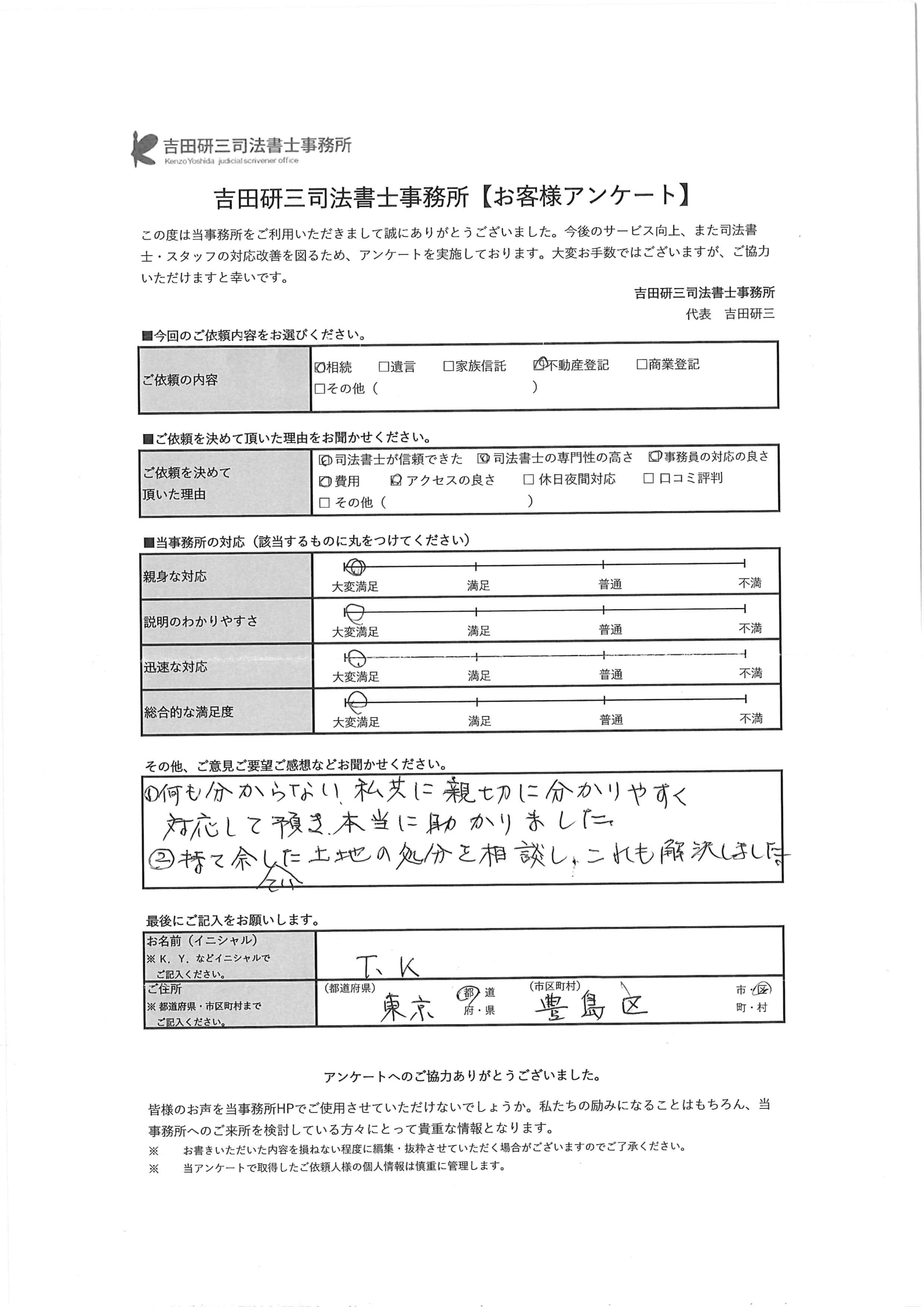 何も分からない私共に親切に分かりやすく対応して頂き、本当に助かりました。(相続・不動産登記 豊島区 T・K 様)