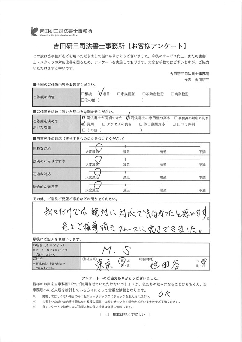 戸籍収集による相続人確定から、遺産分割協議書の作成・郵送手配、預貯金・有価証券の解約まで全て当相談室が主導して行いました。